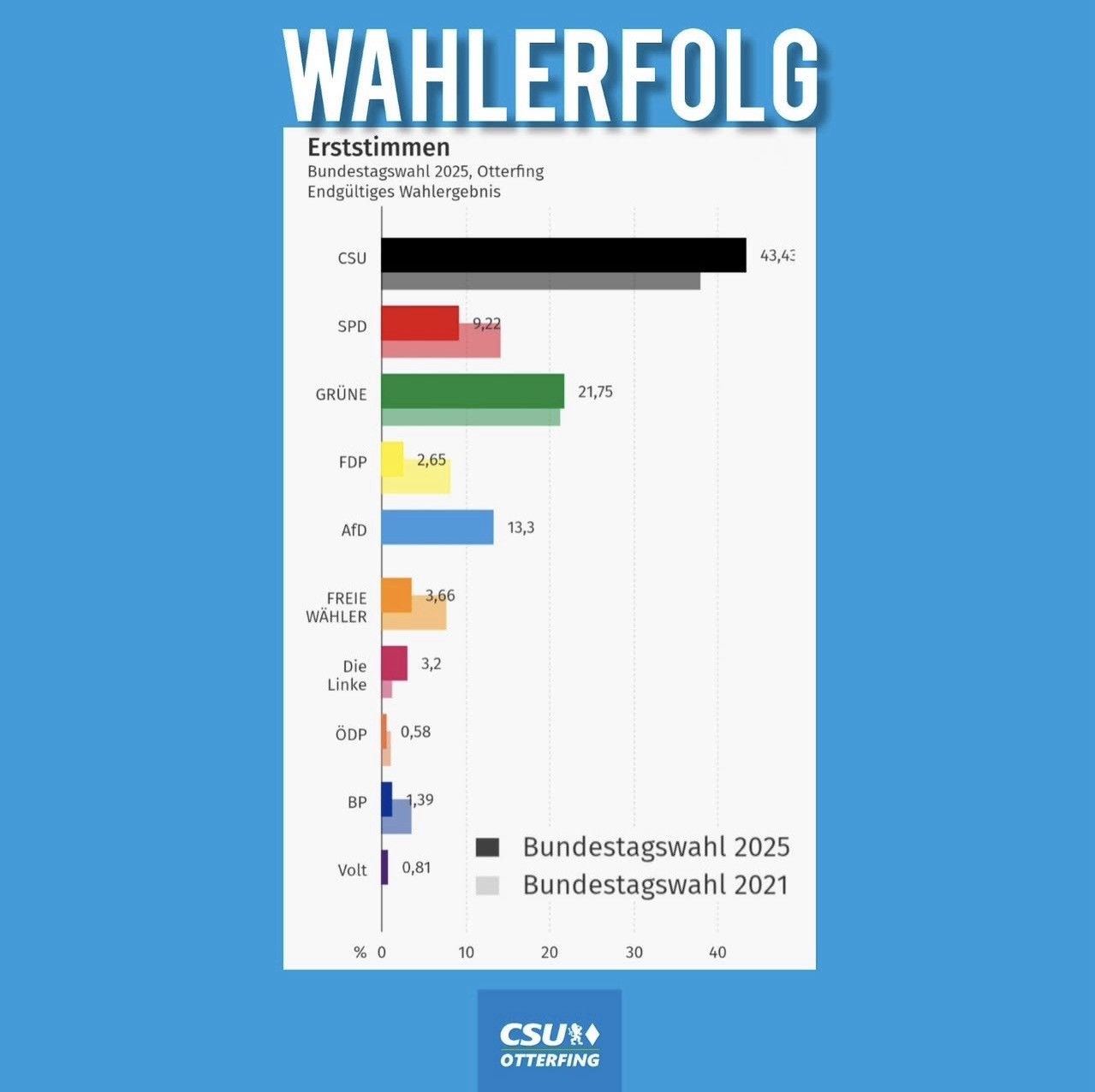 Die Ergebnisse der Bundestagswahl in Otterfing sprechen eine deutliche Sprache – und sie spiegeln den Einfluss der bundespolitischen Lage wider. Die CSU konnte in Otterfing 43,43 % der Erststimmen und 39,32 % der Zweitstimmen erzielen.